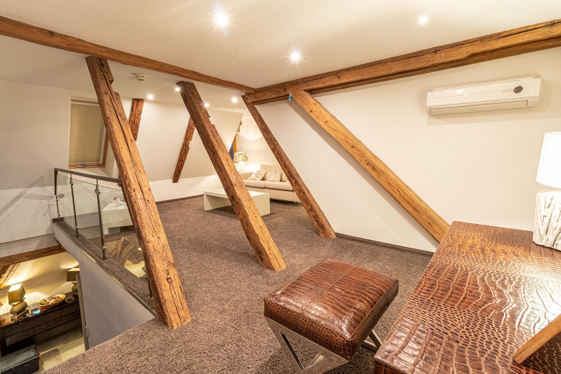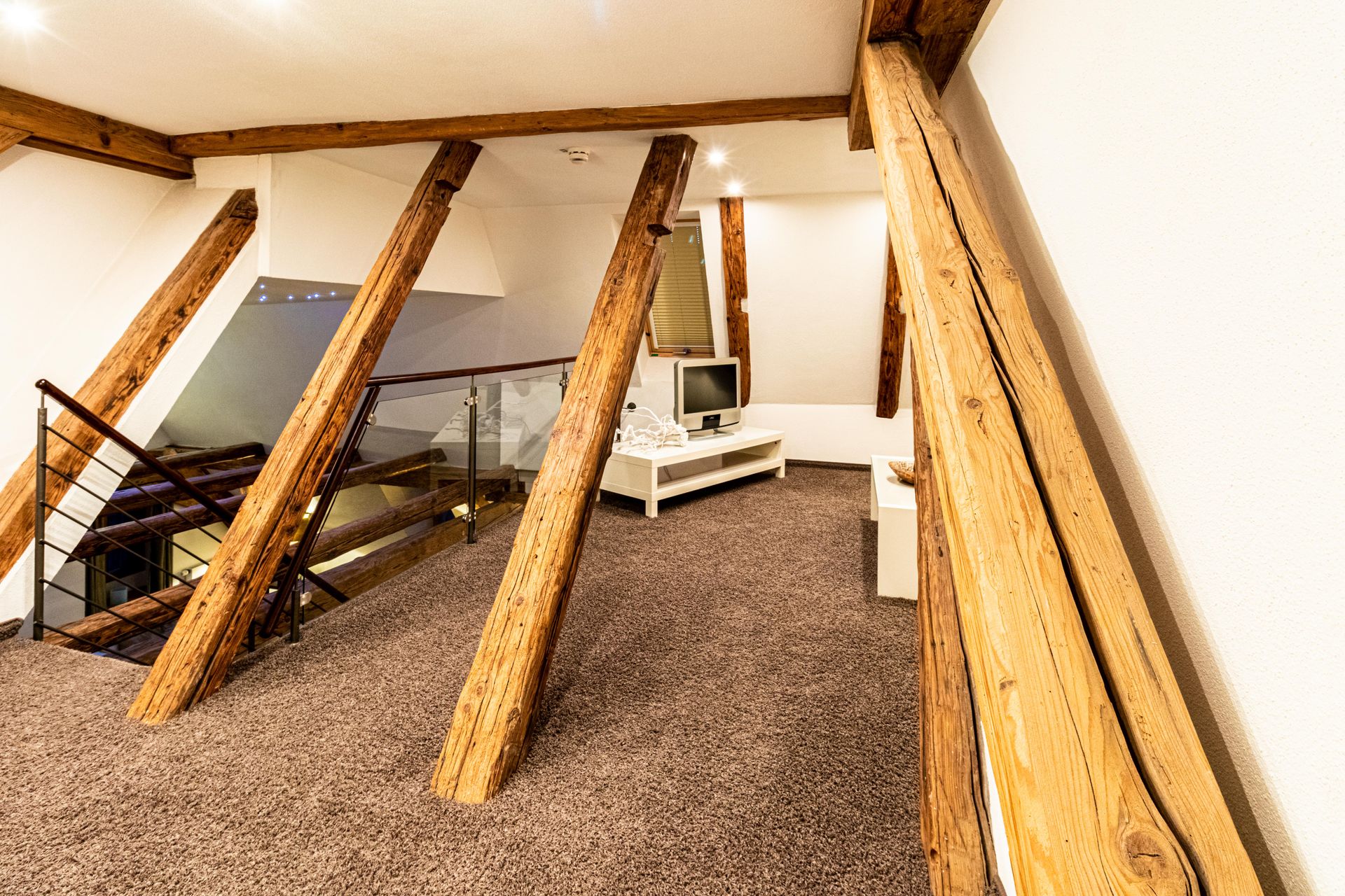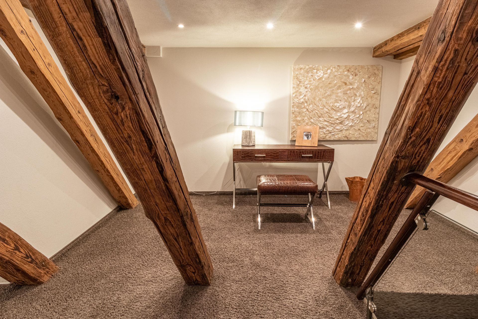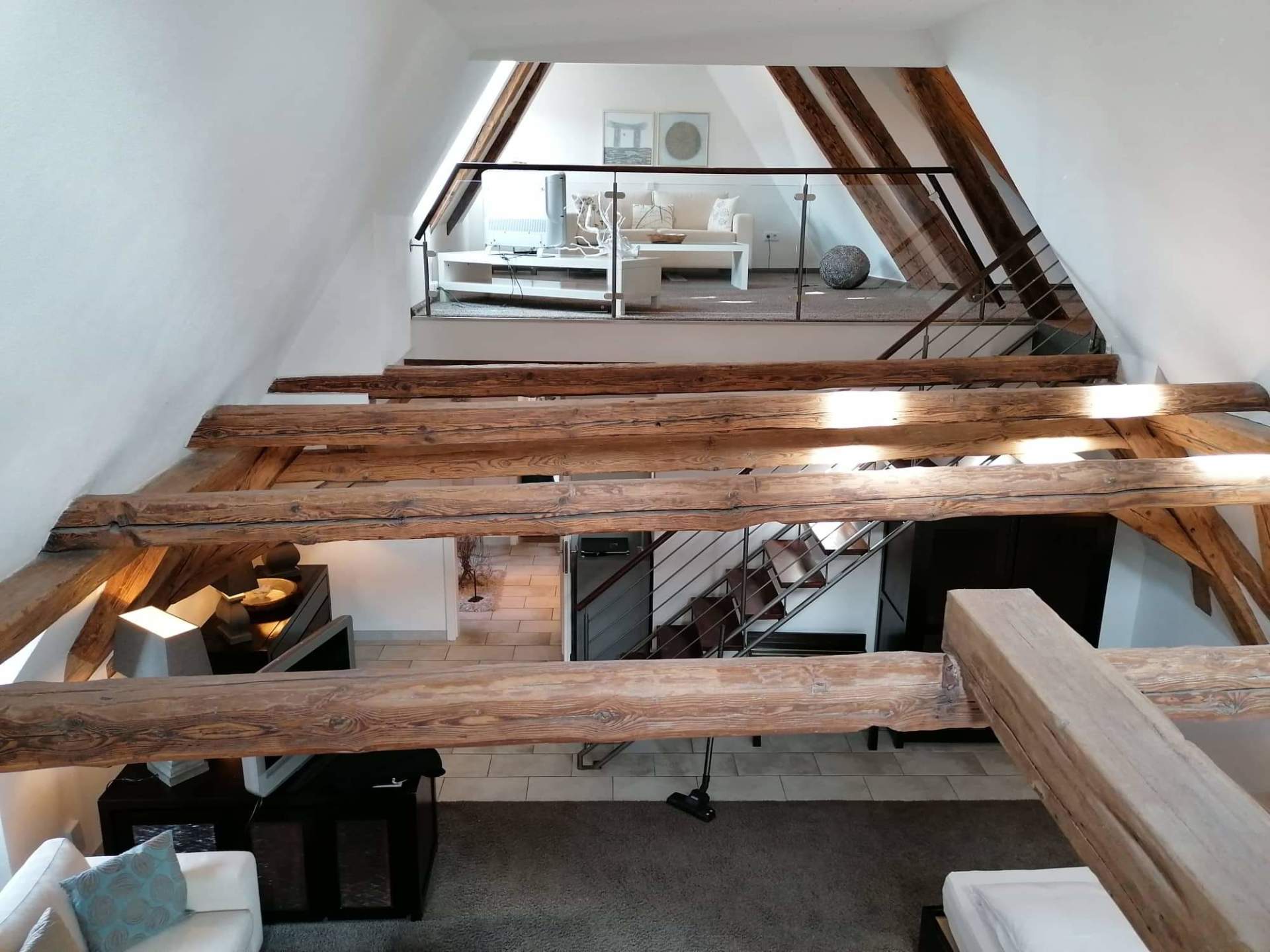 Ansprechende Innenausstattung mit original Holzbalken, natürlichen Materialien,