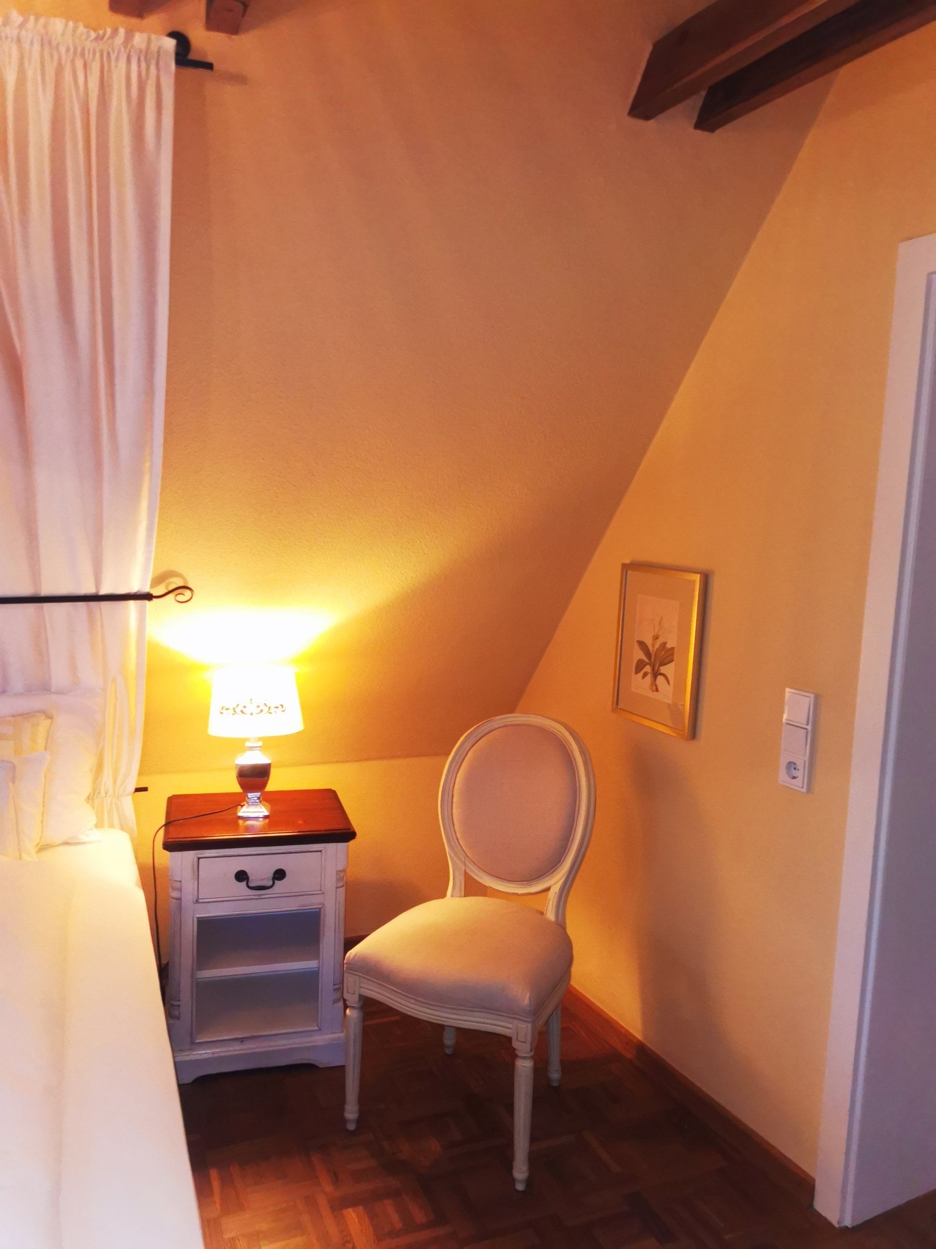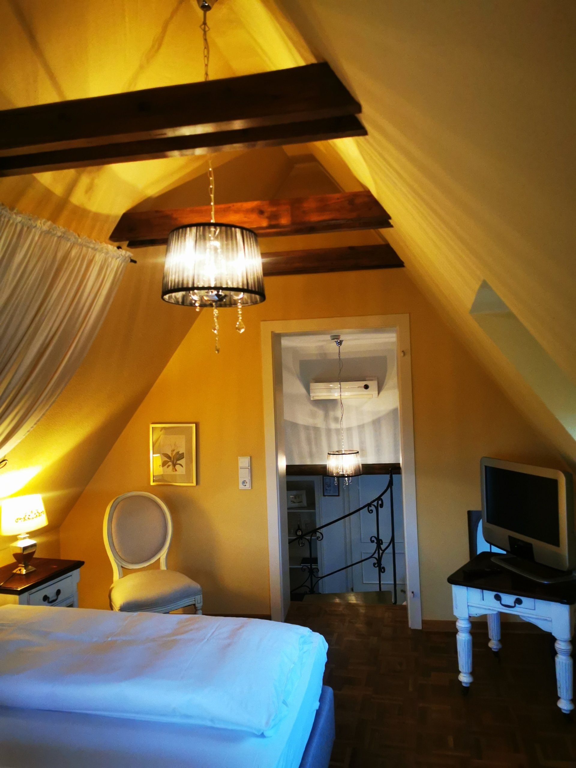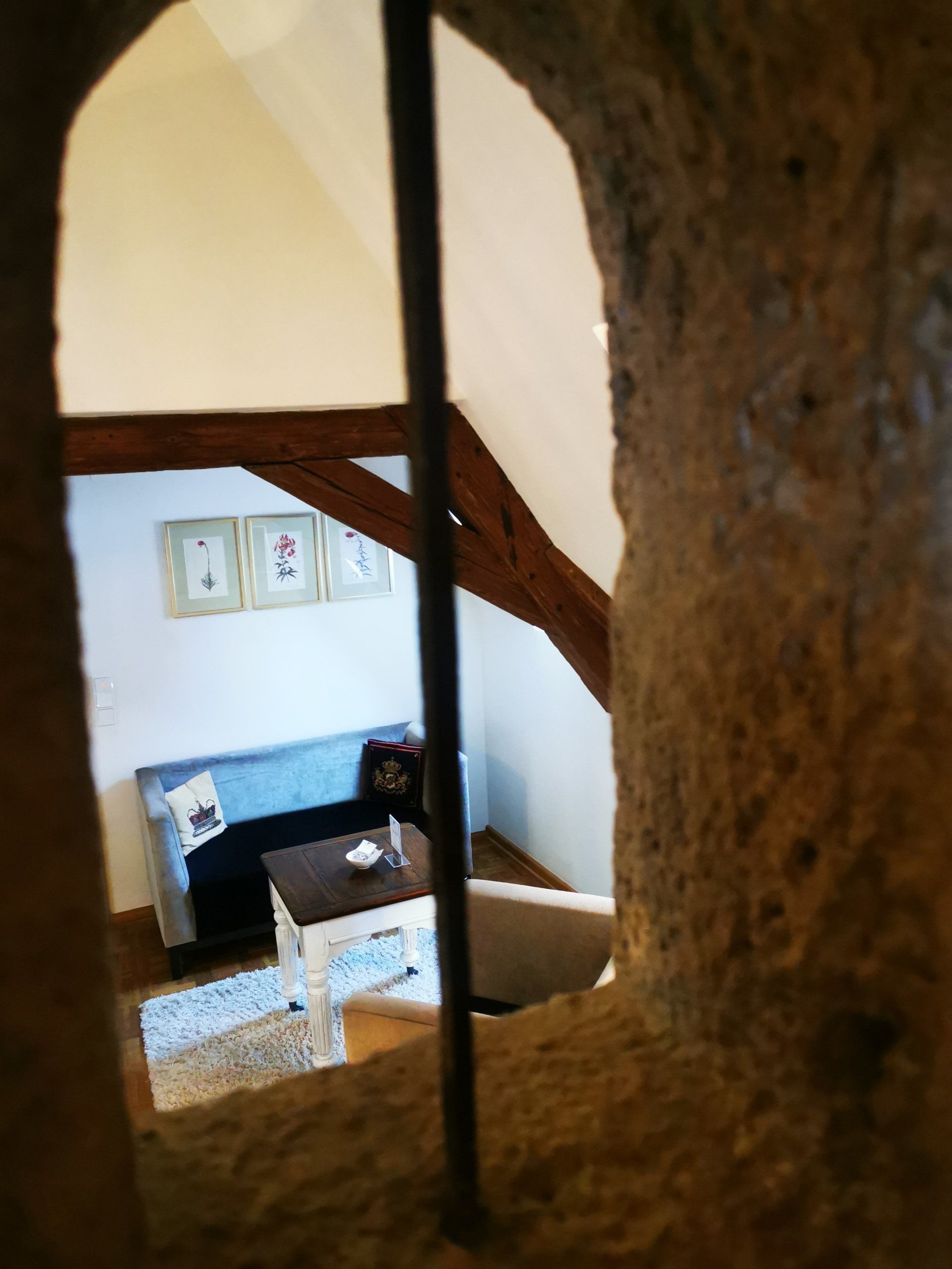 The cosy sleeping area has only one access: the original staircase. Small but not steep. Unique view into the charming baroque garden.