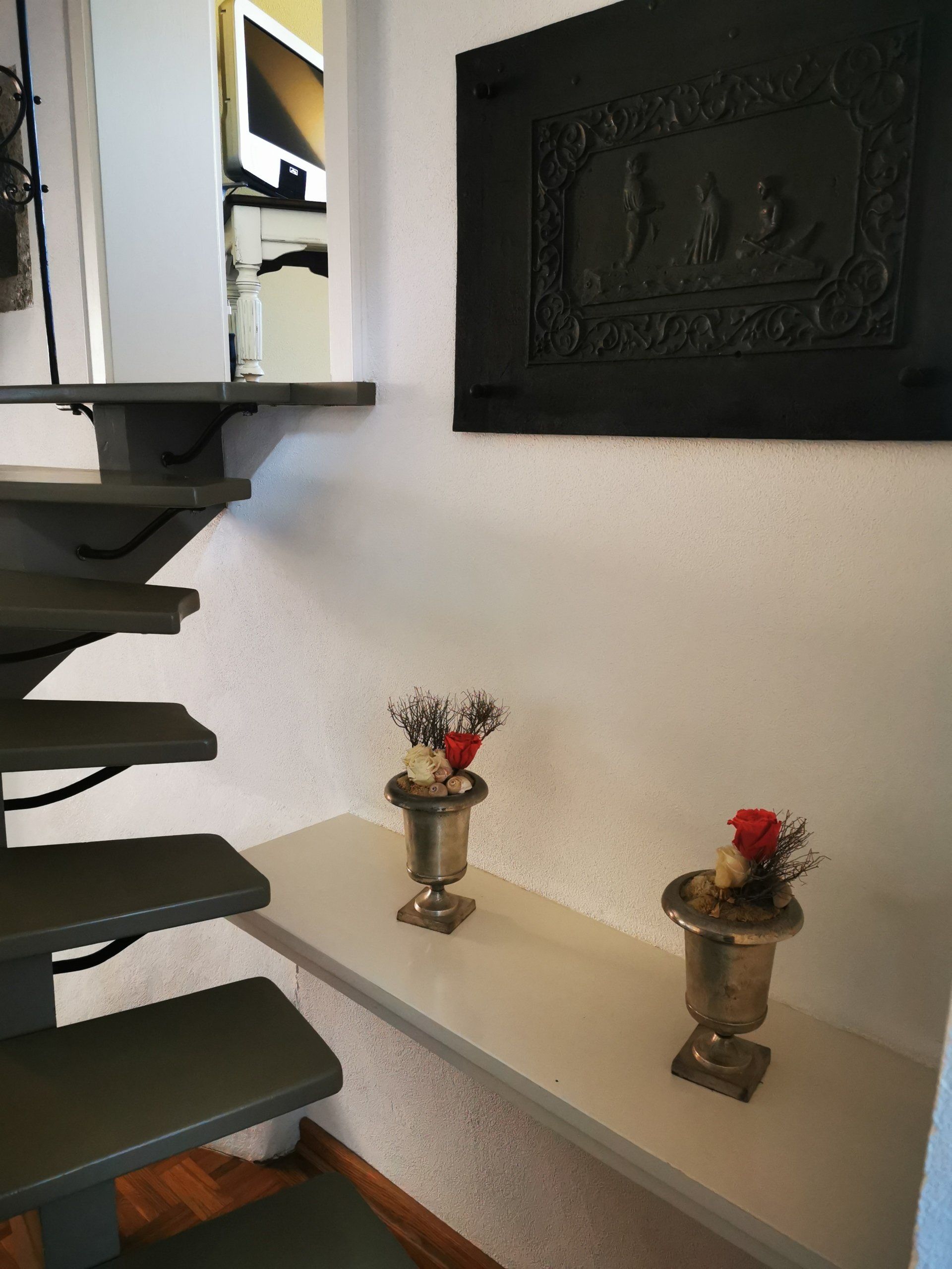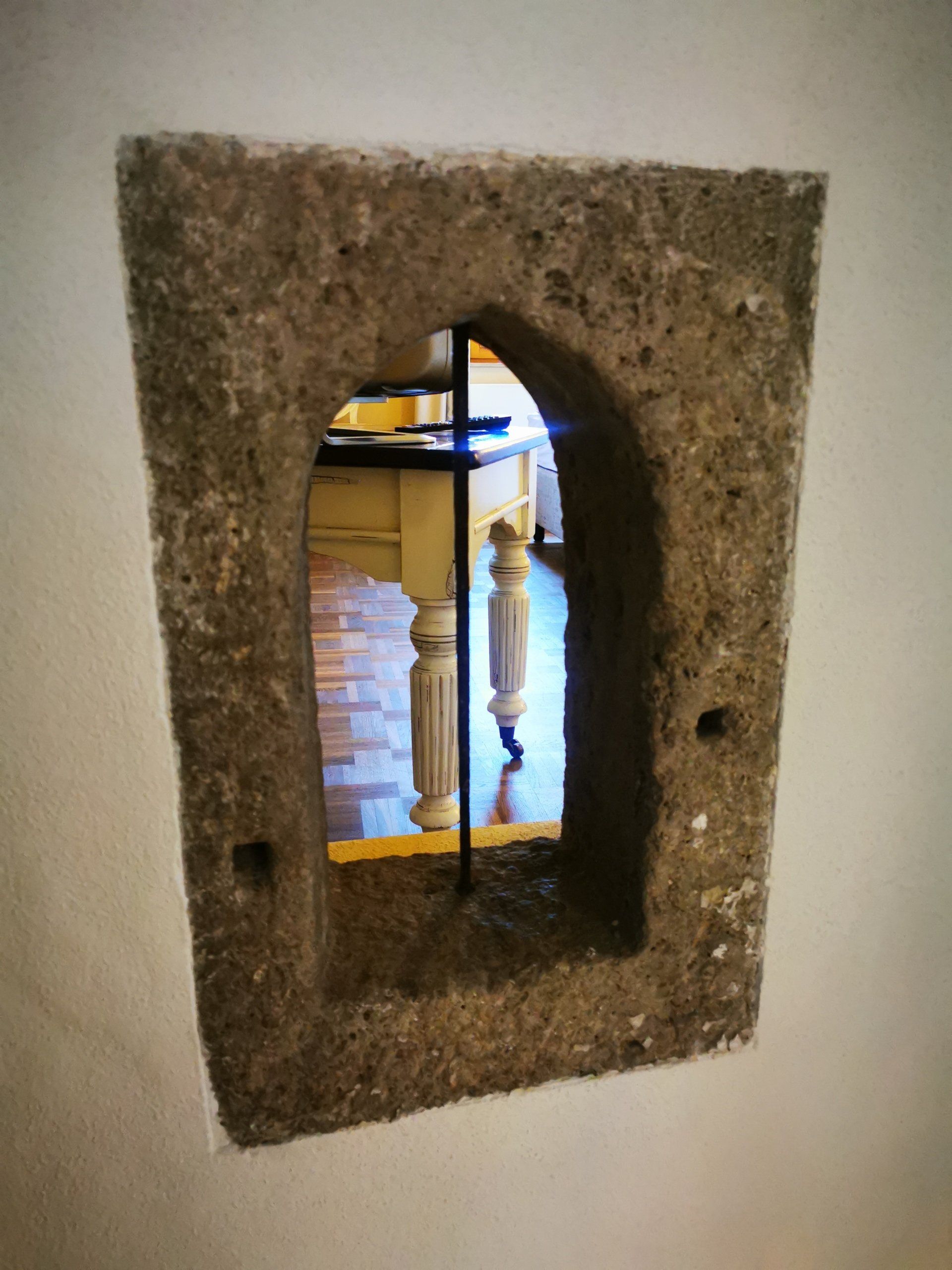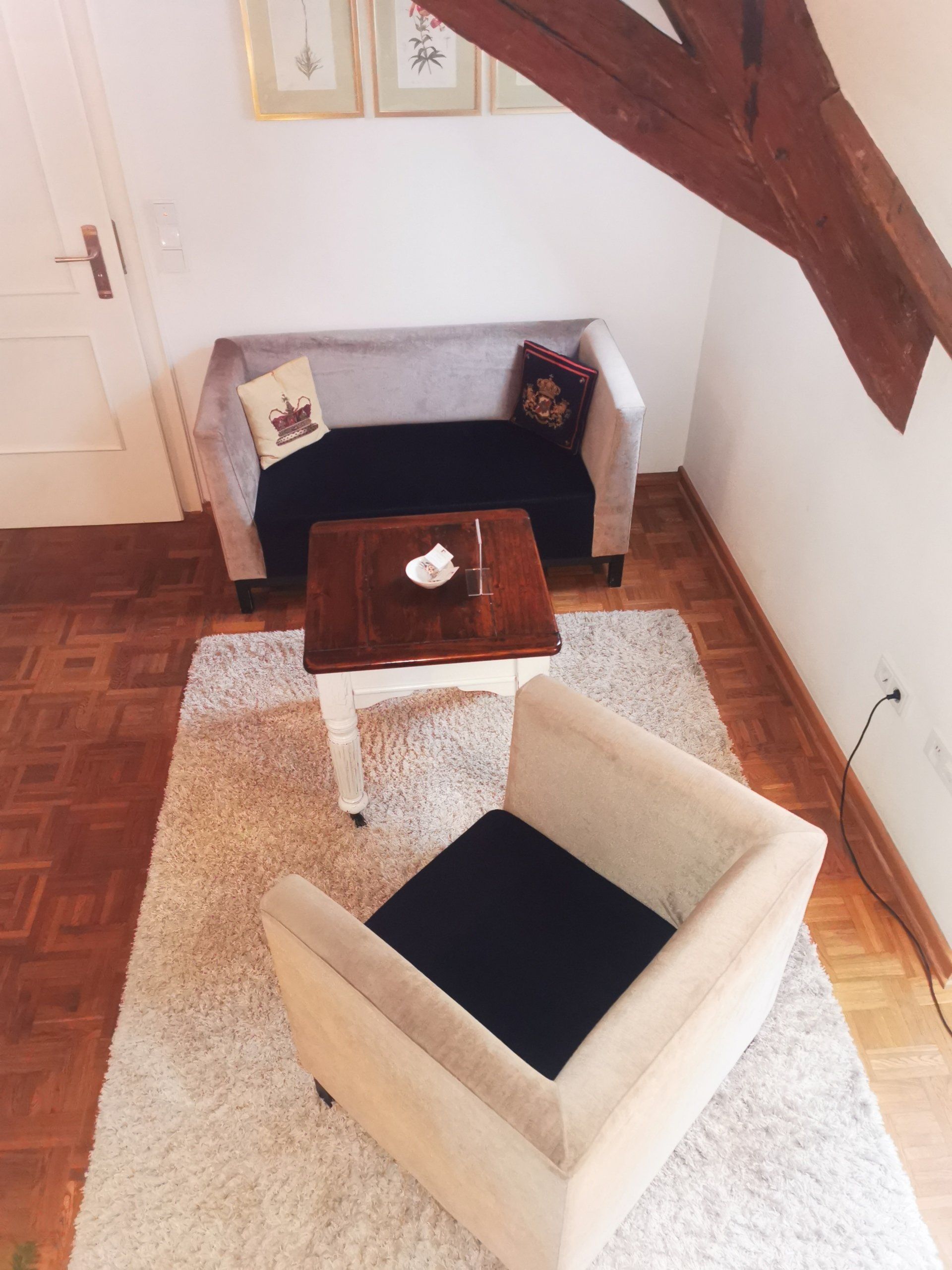 The cosy sleeping area has only one access: the original staircase. Small but not steep. Unique view into the charming baroque garden.